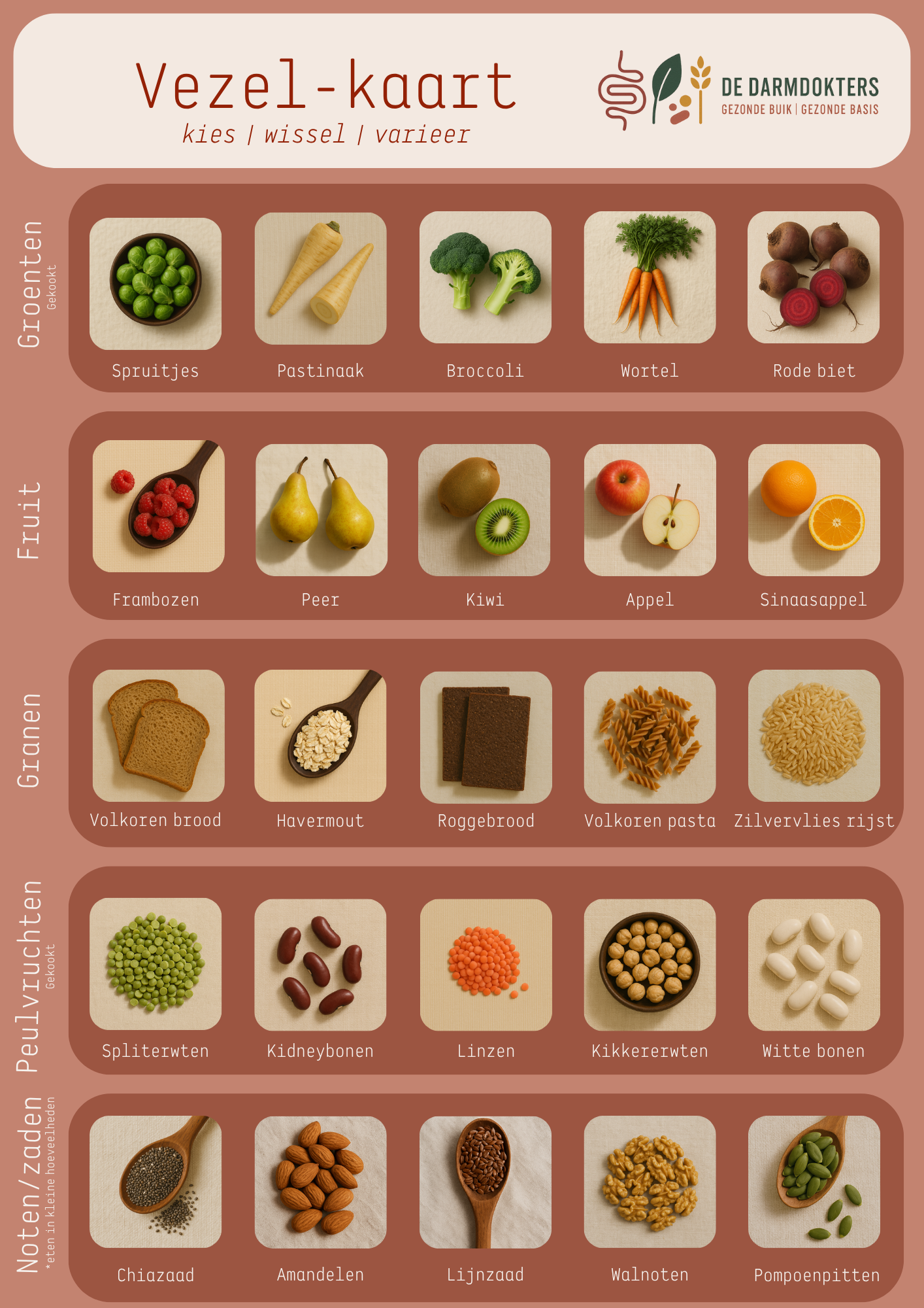 Eet veel soorten vezels. Deze zitten niet alleen in groente en fruit, maar ook in volkoren granen, peulvruchten, noten en zaden.